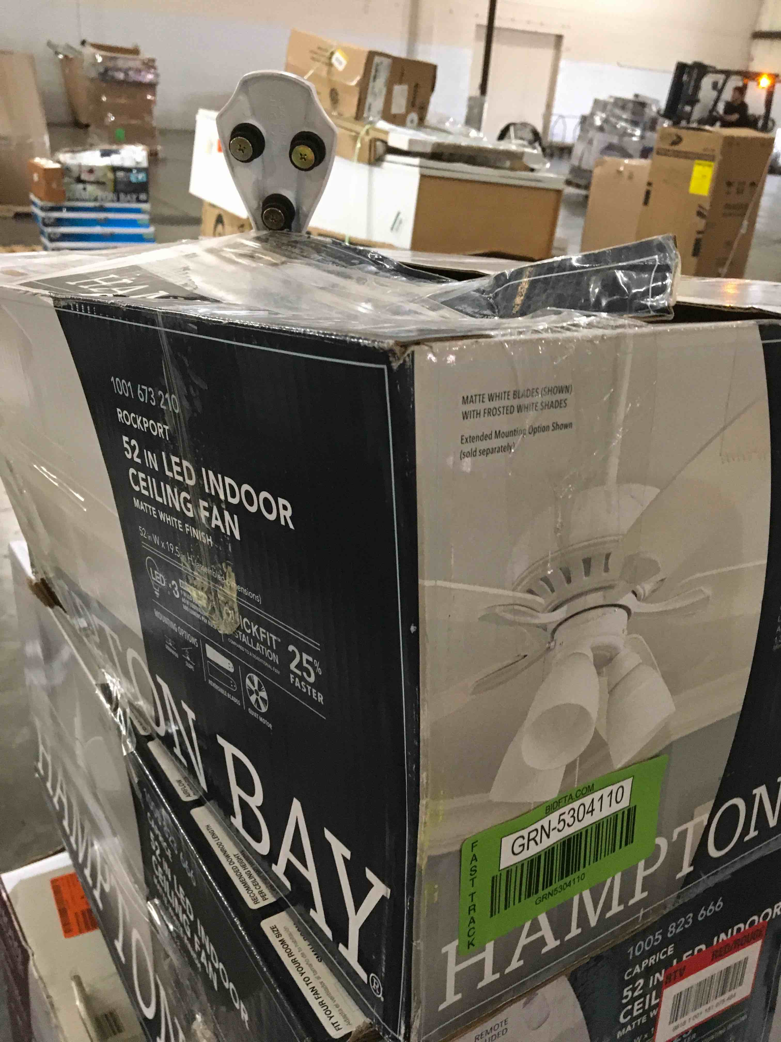 Traditional styling and a quiet motor make the Hampton Bay Rockport ceiling fan a great way to add comfort and style to any room. Installation is quick and easy with a slide-on mounting bracket, QuickInstall blades and the ability to mount on flat or angled ceilings; it's also compatible with extension down rods for high ceilings. In addition, a 3-light kit with 9.5-Watt LED bulbs is included for energy efficiency.