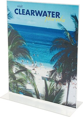 Display specials policies and announcements with this Staples 8.5 x 11-inch vertical stand-up sign holder. Choose this Staples vertical double-sided stand-up sign holder for displaying important policies specials and announcements. This sign holder is constructed with sturdy transparent plastic ensuring that inserted literature is kept safe and easy to read. This Staples vertical stand-up sign holder can be loaded through the bottom with ease and the sturdy base lets it stand on desks or counters on its own. ? Double-sided design lets you display and highlight information on both sides. ? Clear plastic make for durability and better visibility. ? Holds pages with portrait orientation; bottom loading. ? Designed to hold display literature that measures 8.5 W x 11 H. ? Designed to hold display literature that measures 8.5 W x 11 H. ? Can be placed on desktops for easy viewing. ? 12 Pack. ? Sign desktop holder lets you conveniently display signage to ensure maximum visibility. Economical