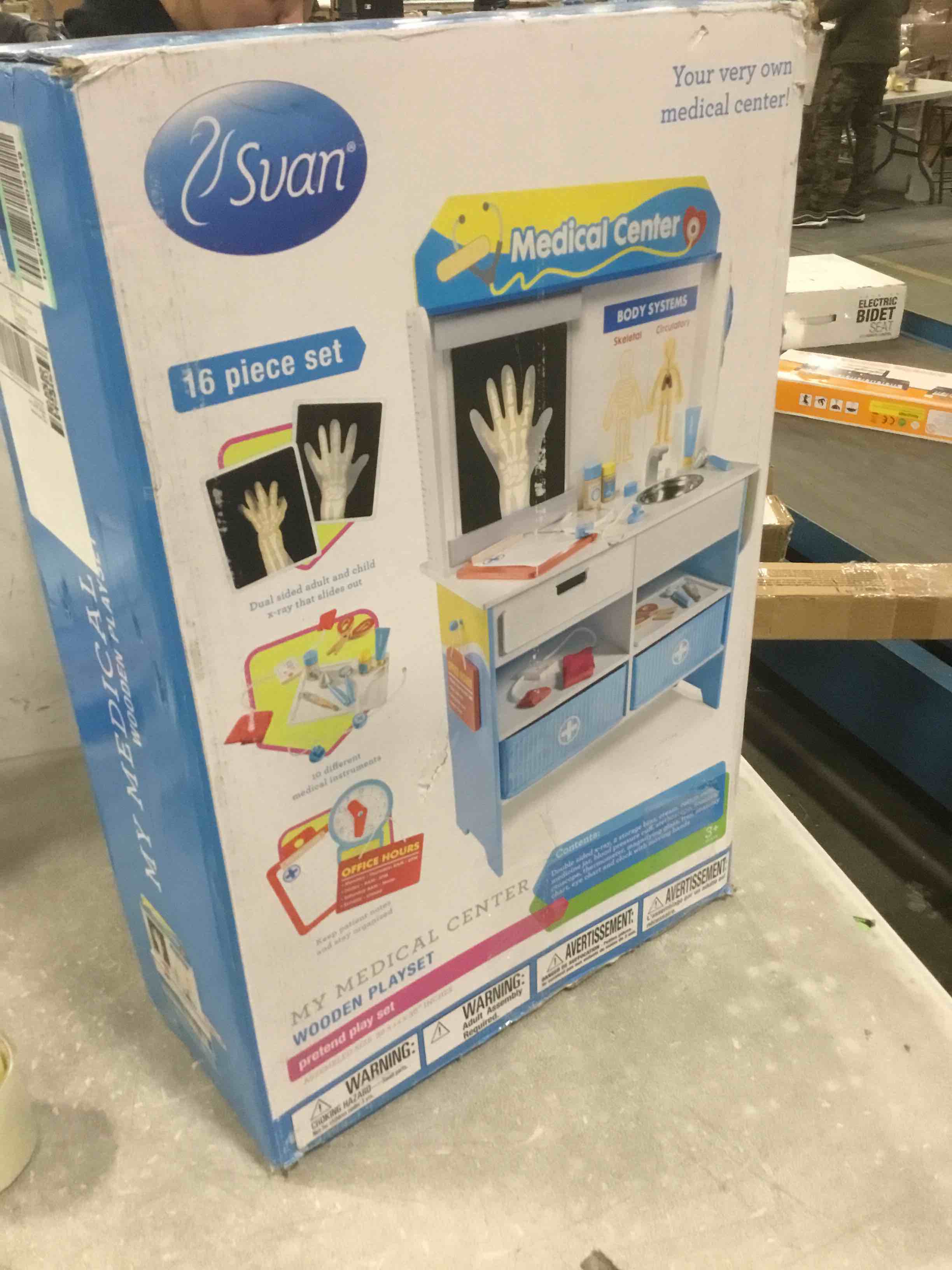 Get Well Doctor Wooden Activity Center - Kid's Pretend Play Medical Playset w 16 Fun Accessories, Dual Sided, Office Checkup Kit X-Rays Blood Pressure Cuff- Roleplaying Center for Boys & Girls 3+ Gift