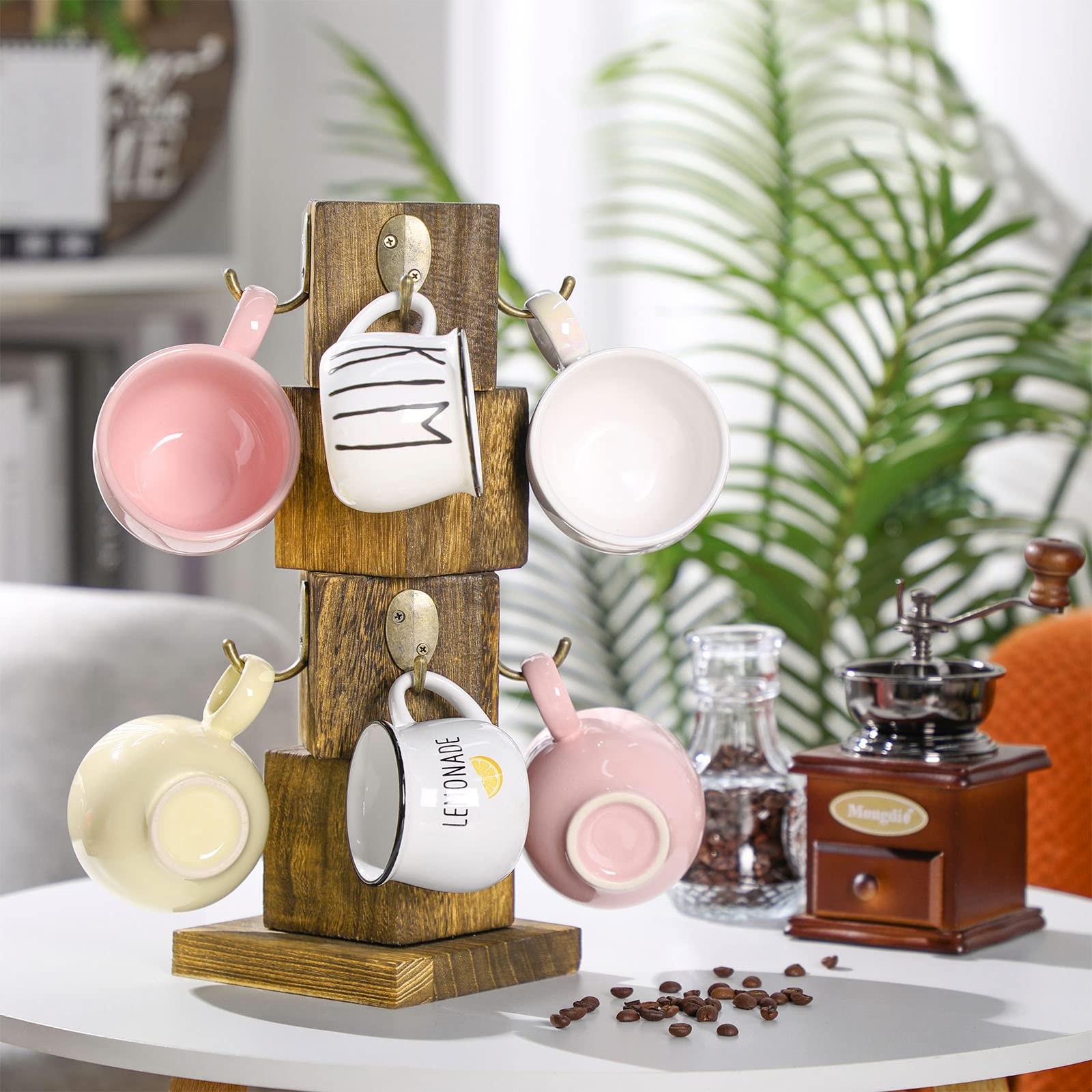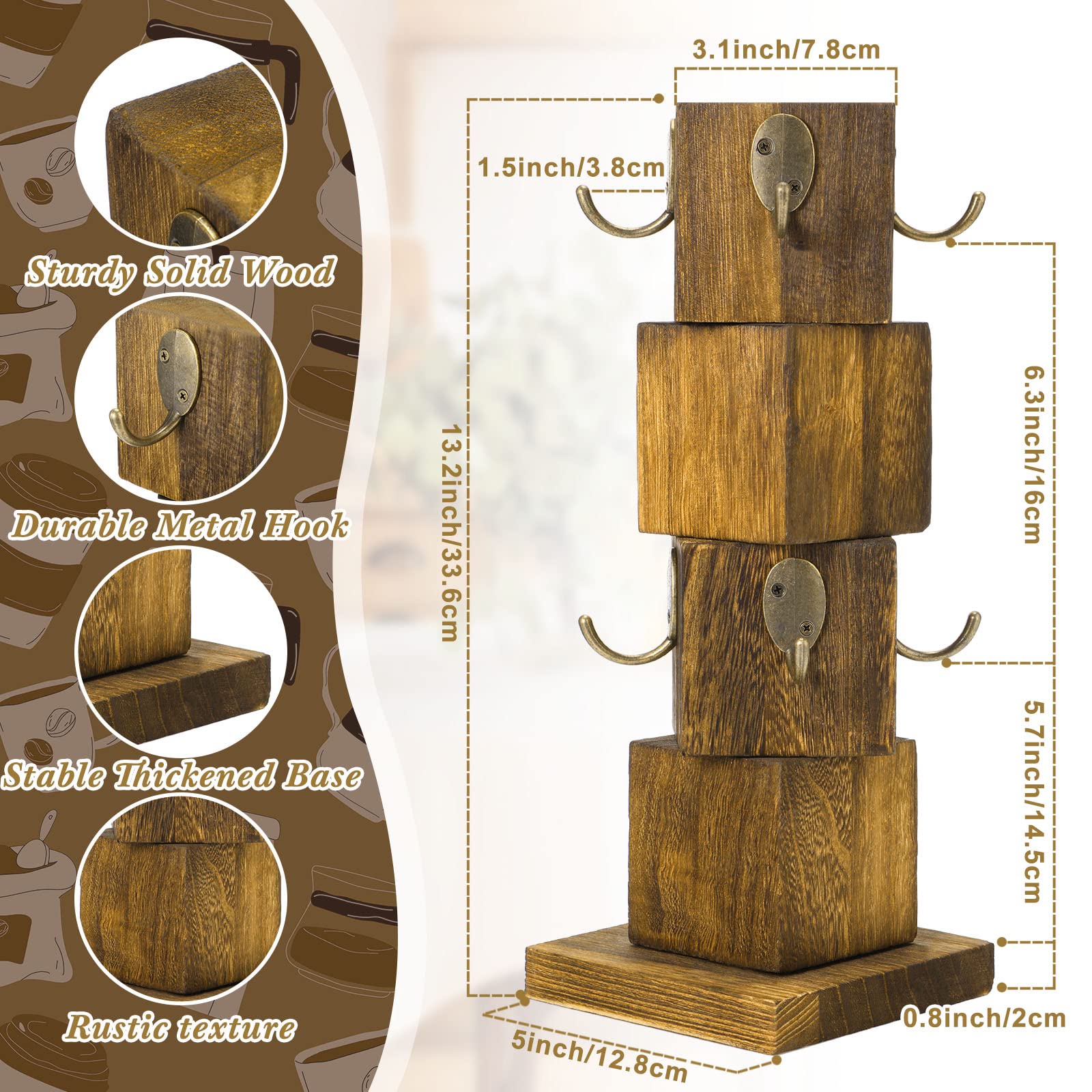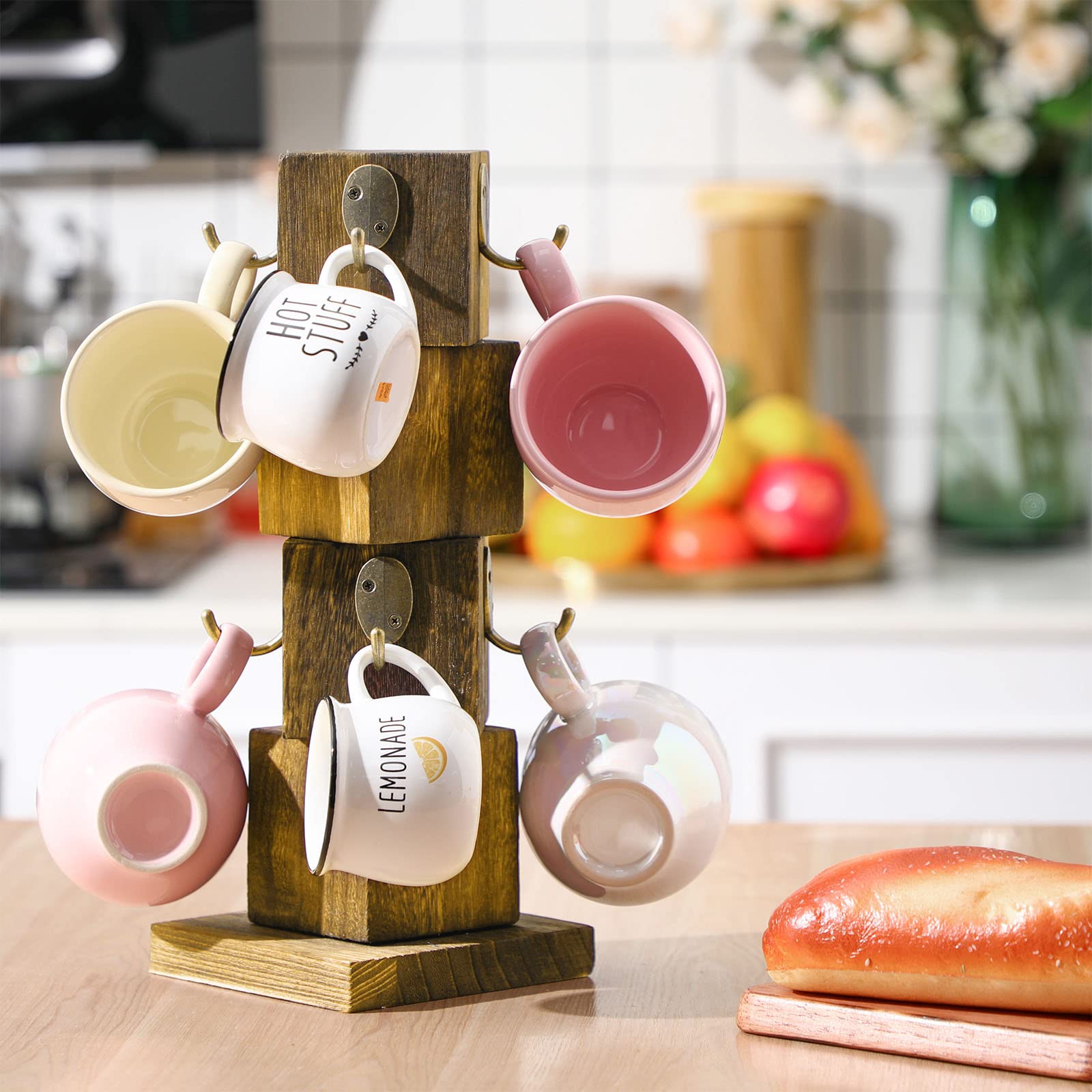Vesici Wood Coffee Mug Holder Rustic Wooden Coffee Cup Holder for Counter Farmhouse Mug Tree Stand with 8 Cup Hangers, Vintage Mug Rack for Coffee Bar Kitchen (Wood Color)