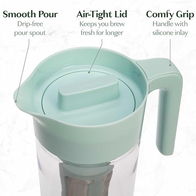 Goodful Cold Brew Iced Coffee Maker, Durable, Shatterproof Tritan Pitcher, Leak-Proof Lid, Large Capacity with Deluxe Stainless Steel Filter, 2.25-Quart, Aqua