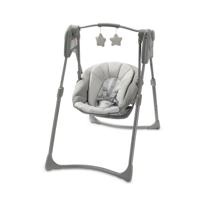 The Graco? Slim Spaces? Compact Baby Swing allows you to experience the space-saving benefits of a compact baby swing without sacrificing the easy interaction with baby that you find with a full-size swing. It features height-adjustable legs, allowing you to choose between compact or full-size mode, and ensures baby is always at the perfect height for interaction. The compact fold makes it easy to tuck away when extra space is needed. The carry handle and battery-operated motor make this swing ideal for ultimate portability.