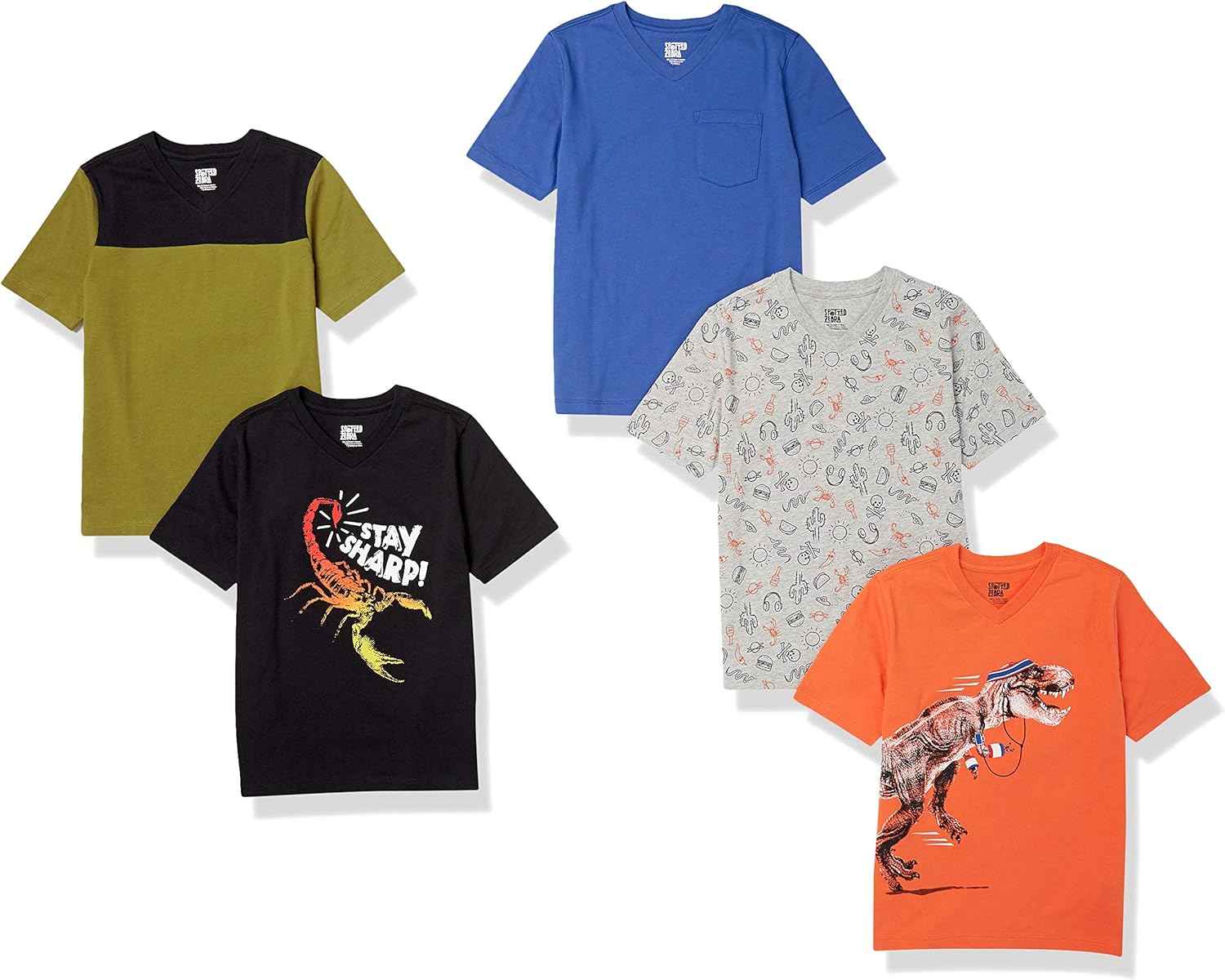 CURRENT BID: $8.20Amazon Essentials Boys and Toddlers' Short-Sleeve V-Neck T-Shirt Tops (Previously Spotted Zebra), Multipacks 5 Blue/Black/Orange, Dinosaur M