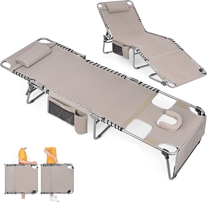 CURRENT BID: $0.10Heavy Duty Tanning Chair with Face Hole Adjustable 5-Position Folding Chaise Lounge Chairs for Outside Portable Lay Flat Beach Lounge Chair for Outdoor Sunbathing Patio Pool Lawn Camping Deck Poolside 1Pc