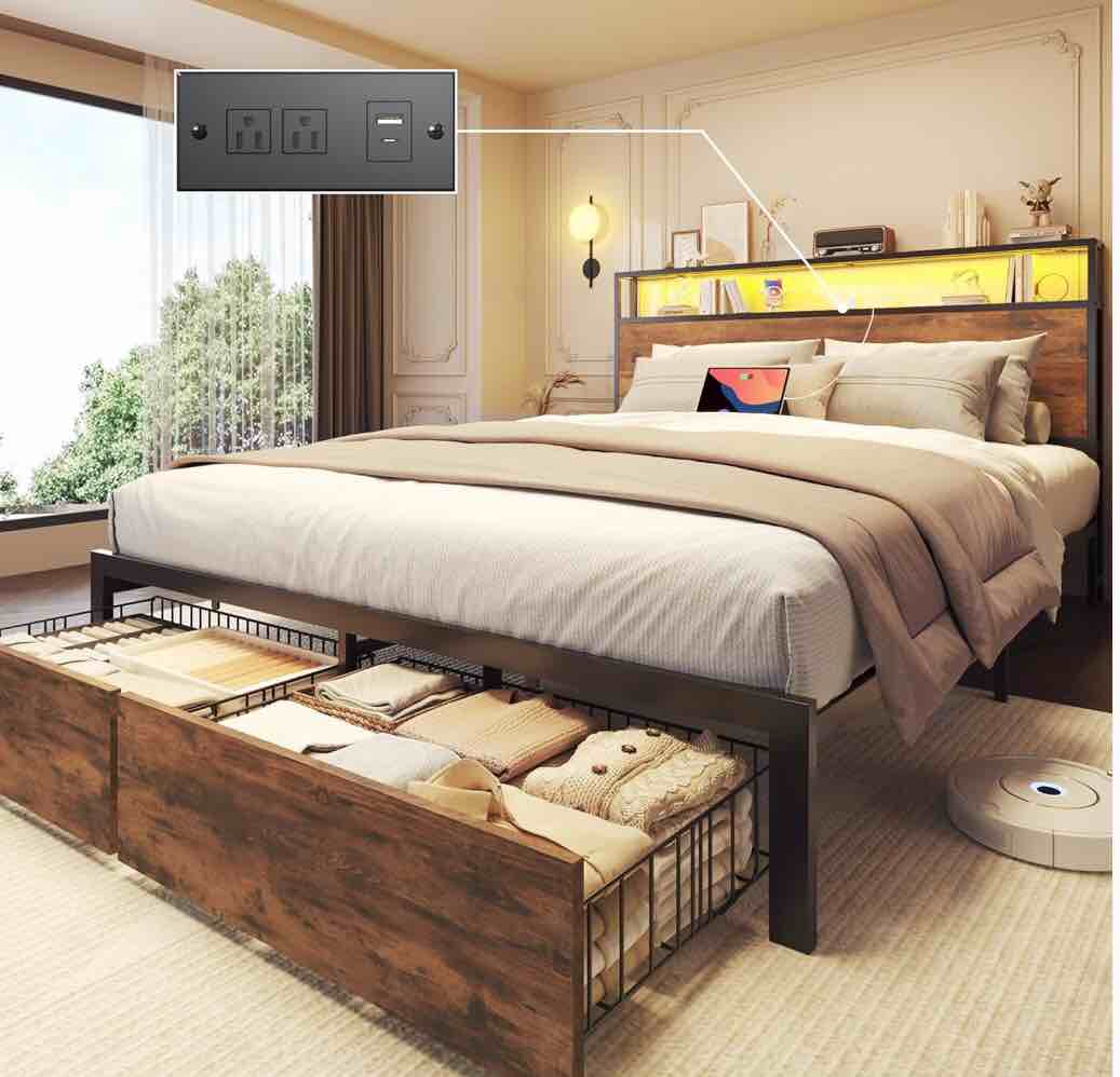 CURRENT BID: $5.56New Queen Bed Base with Charging Station and LED Lights, Metal Bed Frame with 2 Storage Drawers and Headboard, No Box Spring Needed, Easy Assembly
