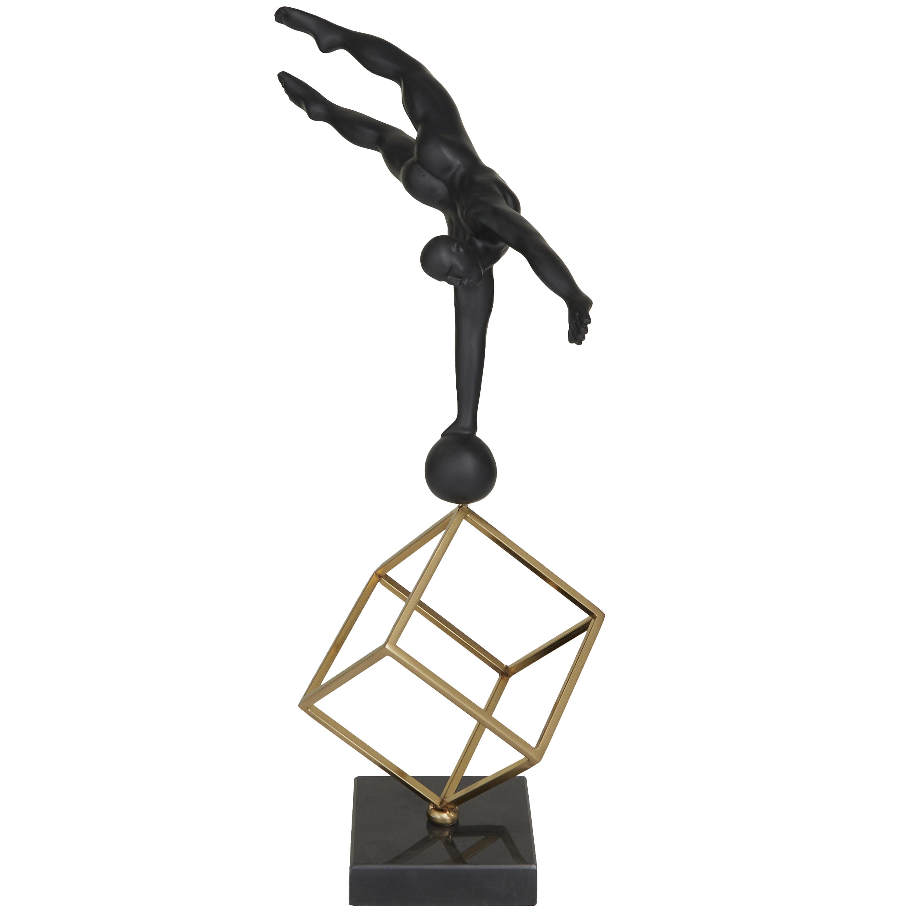 Black Marble Gymnast Decorative Sculpture with Gold Cube Base, 11" x 6" x 17"